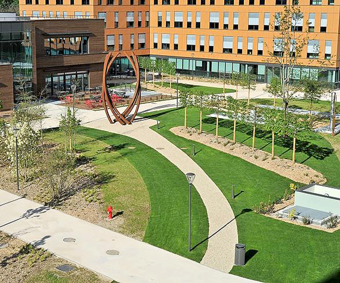 CEMEX also delivered 200 cubic meters (more than 260 cubic yards) of stabilized, reinforced sand to create 1,900 square meters (more than 20,450 square feet) of pathways interconnecting the offices, auditorium, meeting rooms, and catering and caretakers’ facilities of the HQE-certified Plastic Omnium office complex. This proprietary reinforced, stabilized sand is unusual in that it partially consists of recycled glass, which limits its environmental footprint. The main challenge in creating this product is controlling the humidity. For optimum implementation, it must be neither too dry nor too wet. No expansion joints are needed because cracks disappear by themselves thanks to the product’s specific consistency. With its natural sand color, exceptional durability, and incorporation of recycled materials, this user-friendly solution highlights CEMEX’s focus on delivering high-quality, sustainably developed products and services.