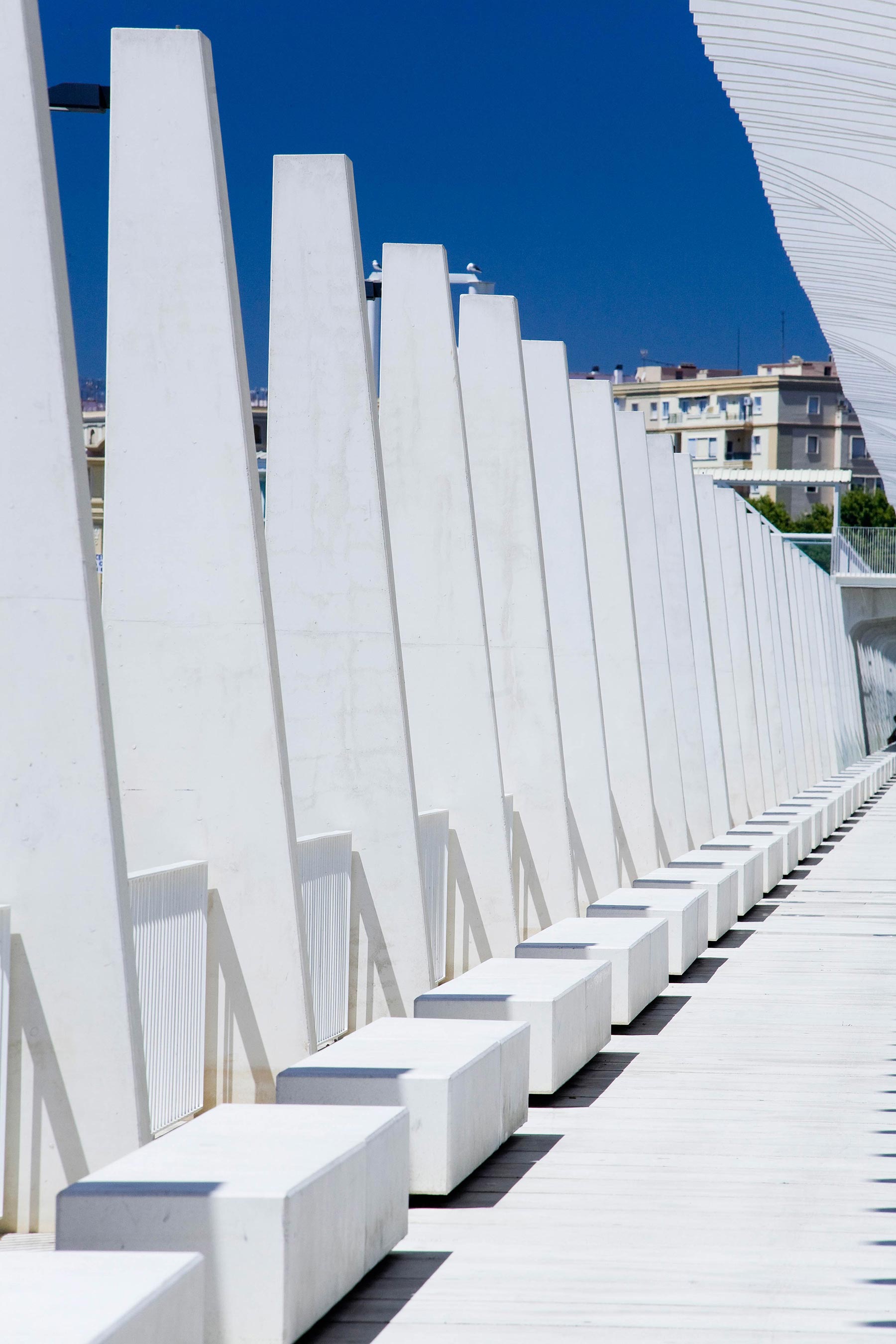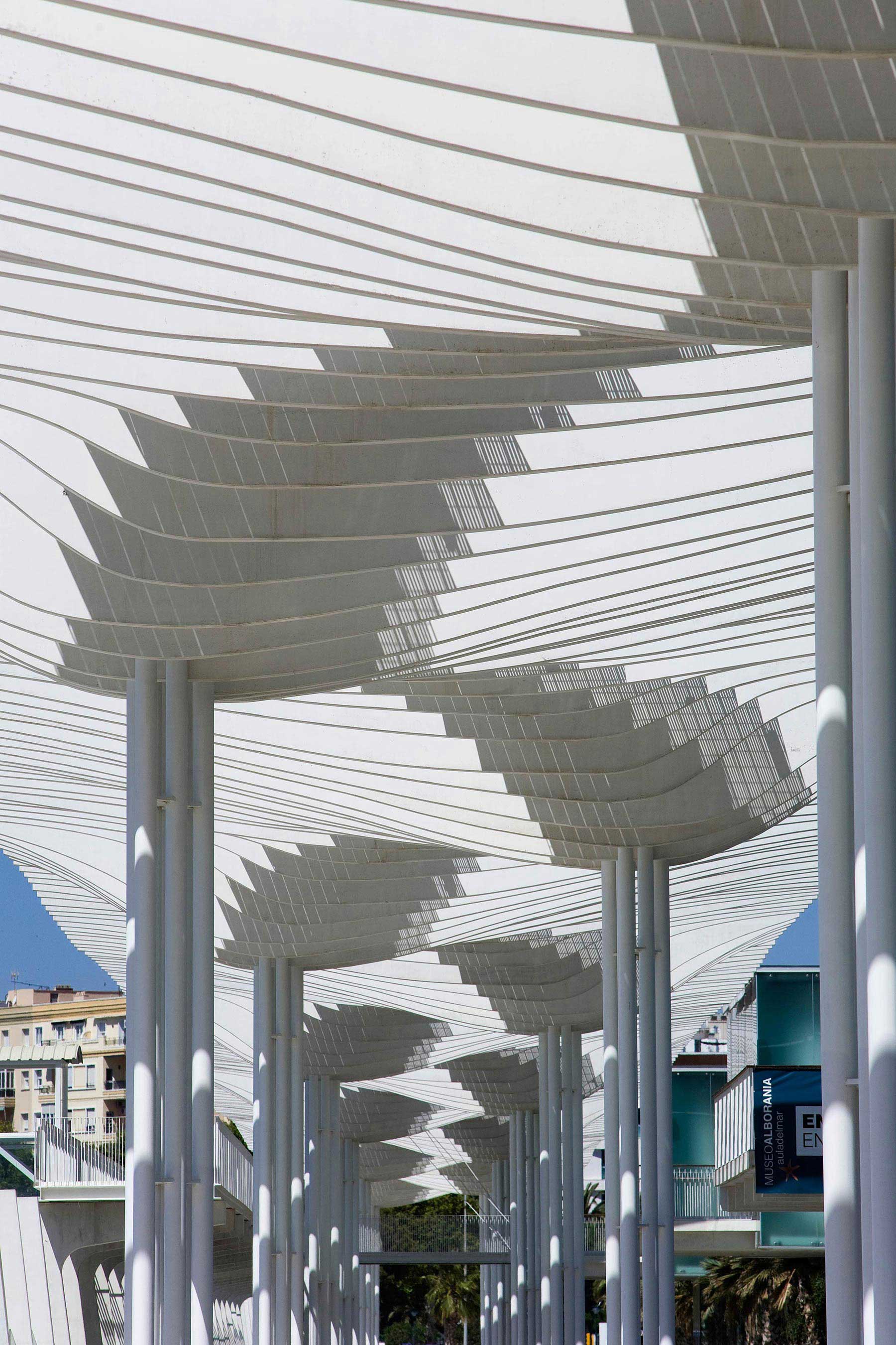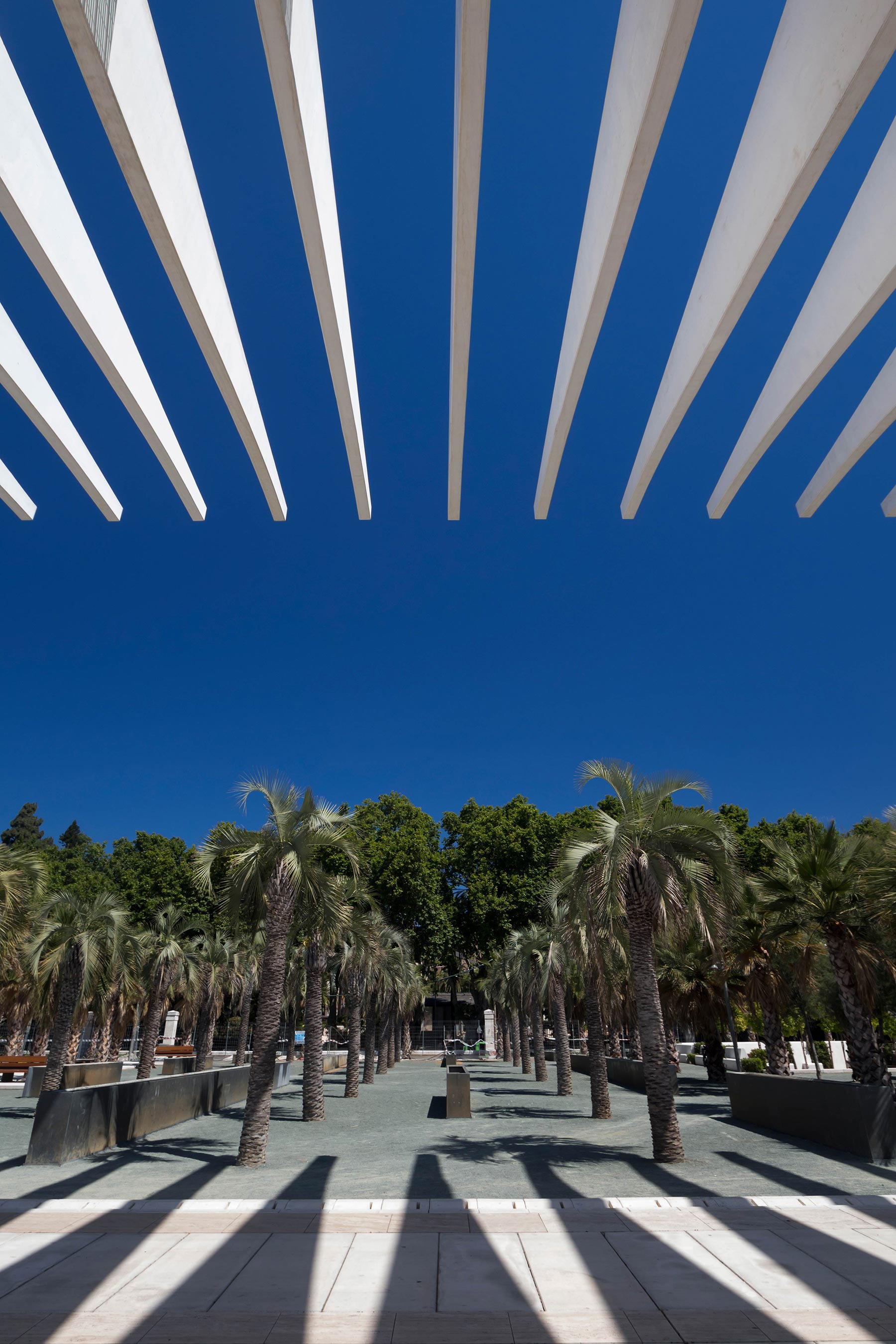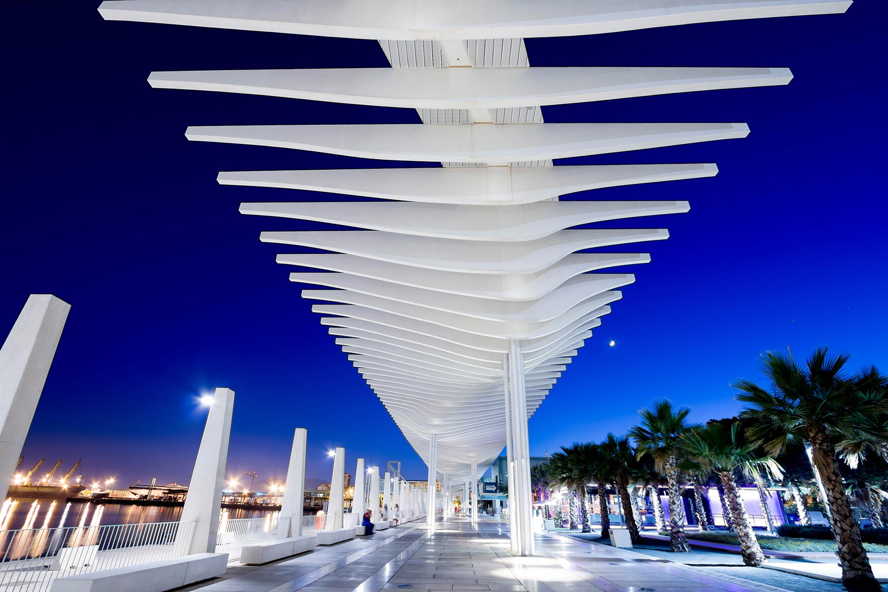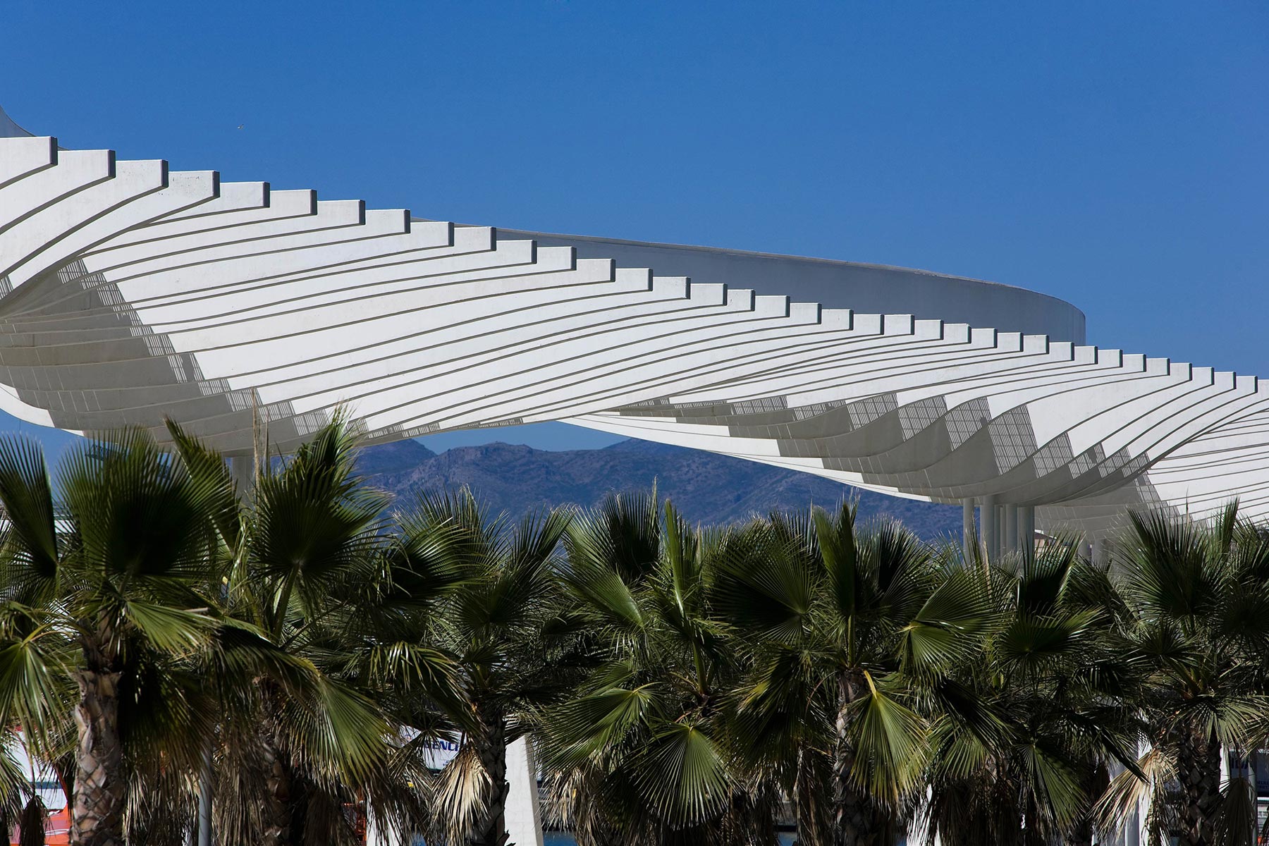 The large promenade is one of the visual standouts of the Palmeral. For its unique design, the architects took inspiration from a metaphor in Herman Melville’s classic novel Moby Dick, wherein the great beached whale resembled the hull of a ship under construction at port. This burst of inspiration led to the design of a 400-meter (more than 1300-foot) runway with a pergola in a shape reminiscent of a fish spine.