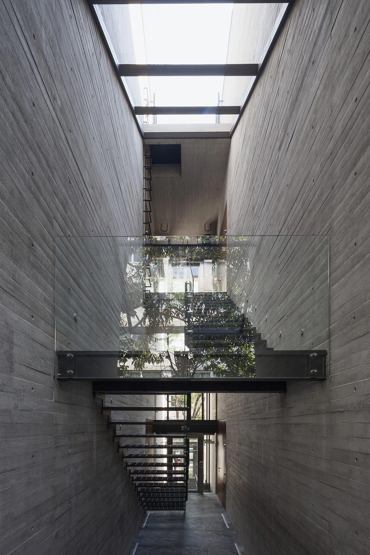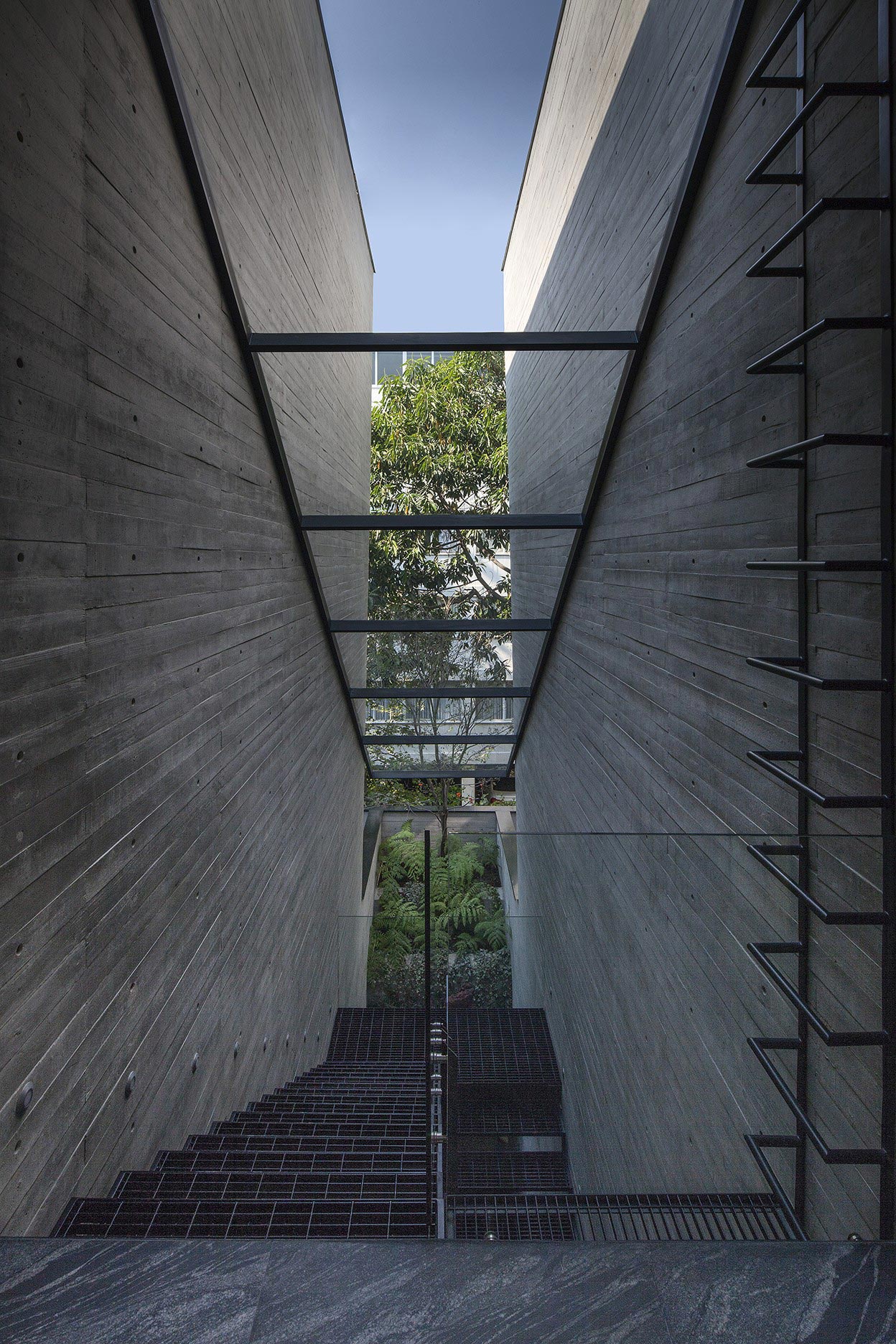 El ingeniero Allan Dayan, representante de la obra, lo define como dos bloques de cristal envueltos por un cinturón irregular de concreto aparente enduelado, elegido por su costo, durabilidad y manejabilidad, sin dejar a un lado el valor estético. El acero complementa el juego de materiales.